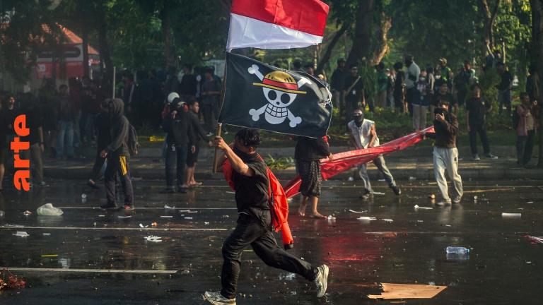 Le dessous des images Le drapeau pirate du manga "One Piece" s'est imposé depuis quelques mois comme le nouvel étendard des mouvements de révolte de la génération Z. De l'Indonésie à Madagascar, du Népal au Maroc, cet emblème est devenu le symbole de la rébellion et de la quête de libertés.