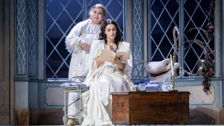 Les deux filles de madame Larina, Olga et Tatiana, vivent dans une maison de campagne près de Saint-Pétersbourg. Elles chantent en duo lorsque paraissent deux invités. Lenski, le fiancé d'Olga, et Onéguine, son ami, s'installent dans le jardin. Olga et Lenski, qui ne se sont pas vus depuis longtemps, conversent gaiement tandis que Tatiana et Onéguine font ensemble quelques pas et échangent quelques mots...