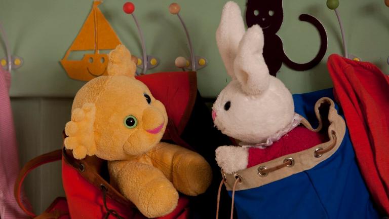 Lief Monster en Klein Zacht Konijntje gaan op reis in de wortelauto van Tante Konijn.