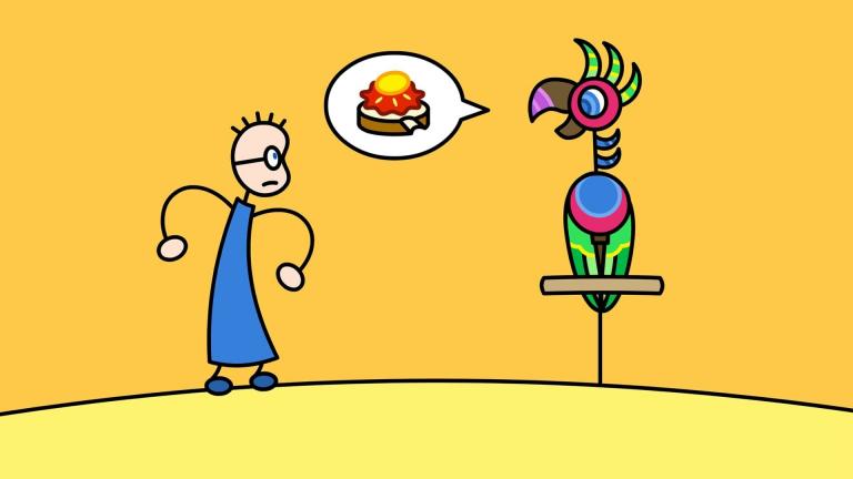 Melk! Pim en Pom springen de keuken in van "het Melkmeisje," van Johannes Vermeer. Zodra het Melkmeisje de keuken uit is, begint Pim, de melkschaal gulzig leeg te drinken.