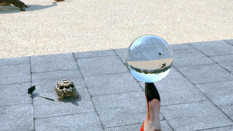 Un flamant rose jongle devant une tortue, fascinée par le spectacle et bien décidée à en profiter malgré les problèmes de circulation en arrière-plan.