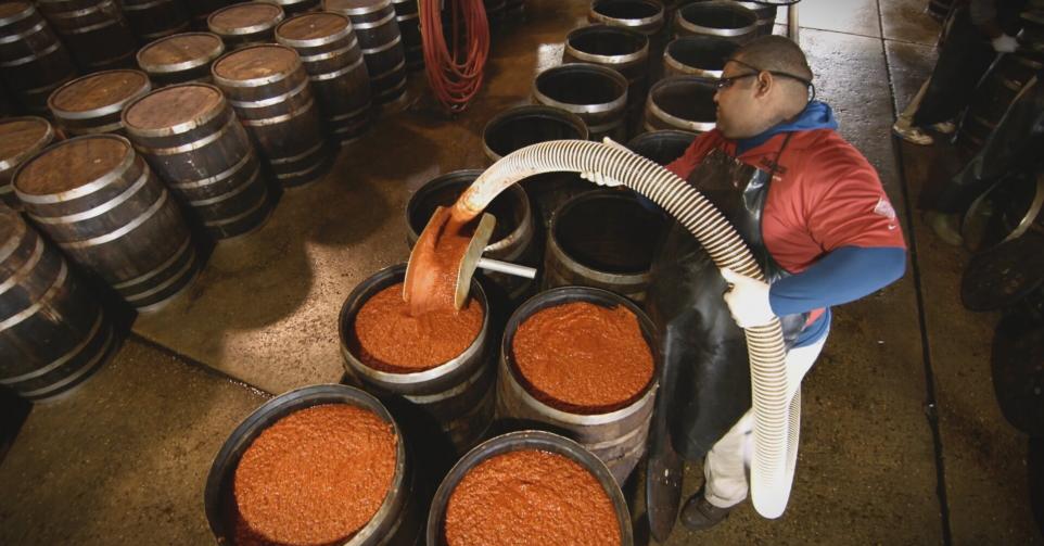 La fabrication de la célèbre sauce pimentée. Autrefois simple piment cultivé dans les fermes d'Amérique centrale et du Sud, ce fruit épicé s'est répandu aux quatre coins du monde.Casting