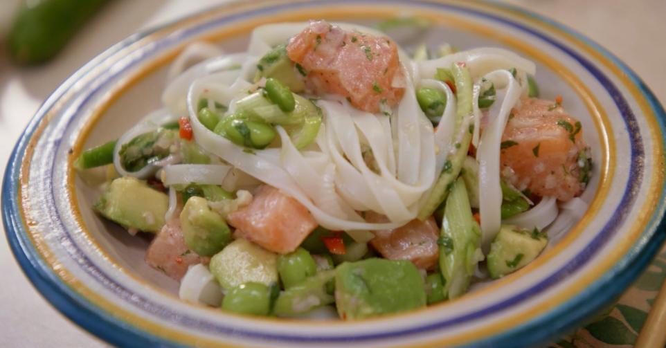 Bij deze noedelsalade draait het allemaal rond de Thaise dressing: je gebruikt ze om de zalm en de salade op smaak te brengen.