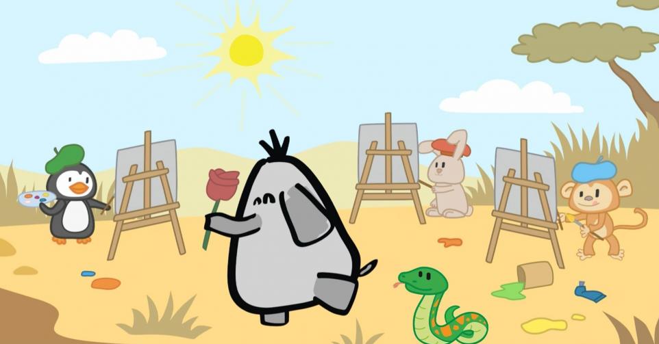 Ellie de Olifant staat heel stil. Haar vriendjes zijn haar aan het naschilderen. Stuk voor stuk maken ze prachtige schilderijen. Slang is verdrietig. Hij wil ook meedoen, maar hij heeft geen handen om een kwast vast te houden. Ellie bedenkt een oplossing waardoor Slang zijn kunsten toch kan tonen. Wat een talent!