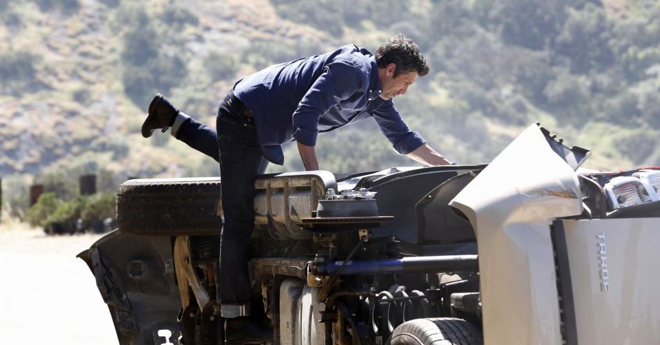 En route pour l'aéroport, Derek est témoin d'un accident. Une voiture conduite par un adolescent percute celle d'une femme et de sa fille. Derek soigne les blessés en attendant l'arrivée des secours. Mais une fois les blessés évacués, il est à son tour victime d'un accident : il est percuté par un camion...Casting