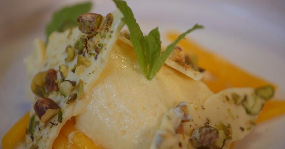 Mousse van mango met yoghurt, salade van mango en munt en studentenhaver met witte chocolade en pistachenootjes.