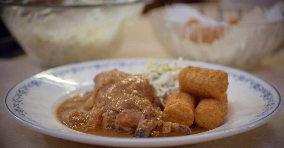 Een stoofpot van konijn met peperkoek, appelen en cider, witloofsla met appel en kroketten.