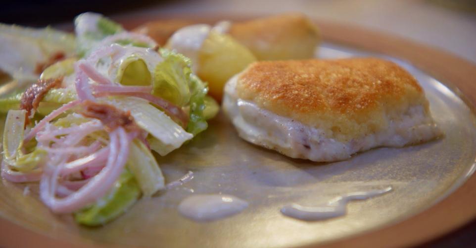 In de oven gebakken vis met een korst van parmezaan en panko, Romeinse sla met caesardressing en gebakken krieltjes.