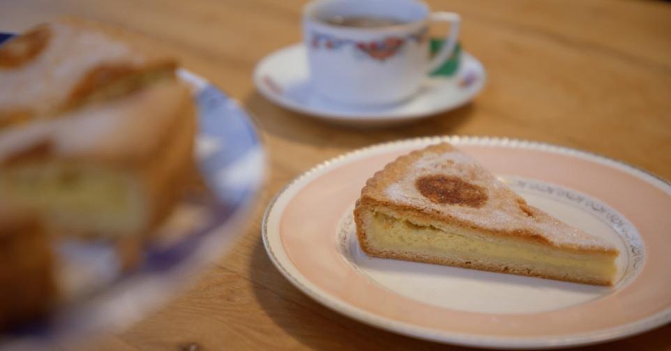 Een dichte vlaai met een vulling op basis van pudding, afgewerkt met suiker en blokjes boter.
