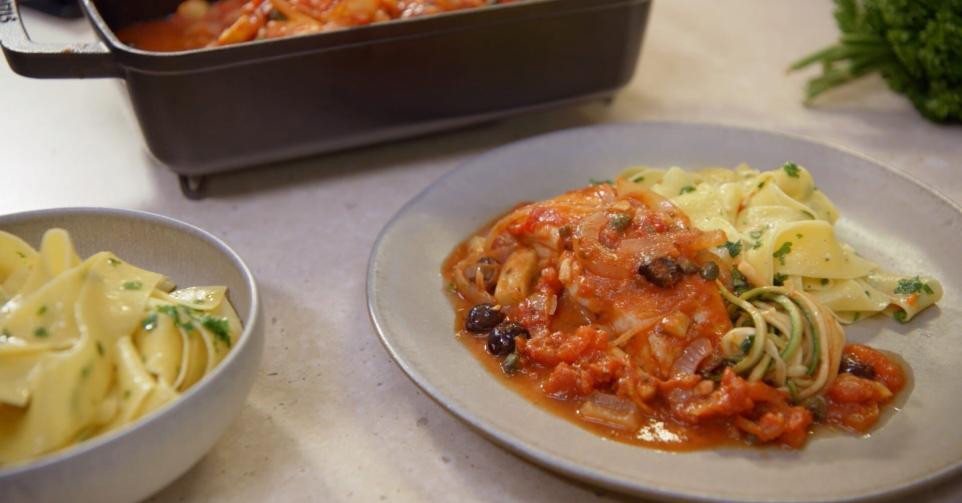 Een ovenschotel met koolvis, tomatensaus met kappertjes en ansjovis en lintpasta.