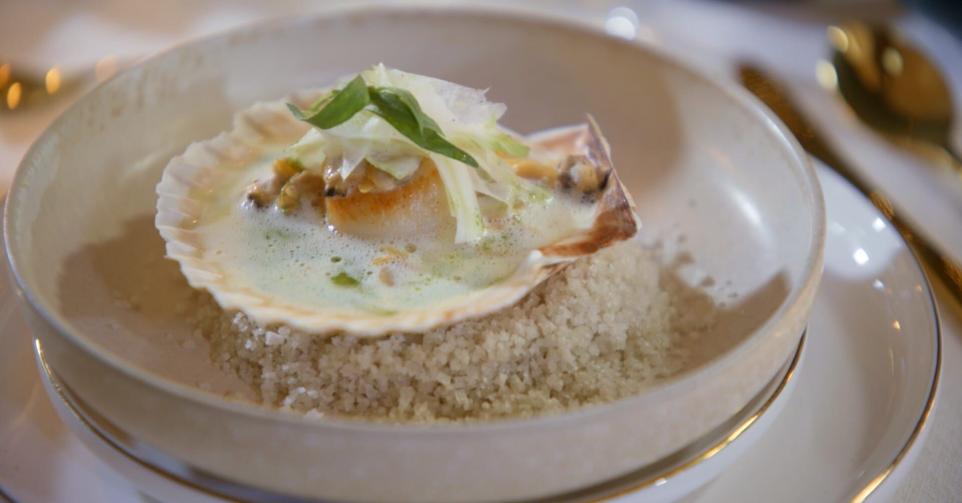 Gebakken sint-jakobsvruchten in een romige saus van venusschelpen, fijngesneden venkel en selderolie.