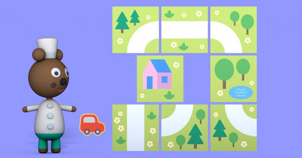 Maak een taart in mozaïek, Mimi rijdt met de bus en tankt de bestelwagen van Toto vol. Pepe maakt een schuifpuzzel en Zaza zoekt de juiste vorm.
