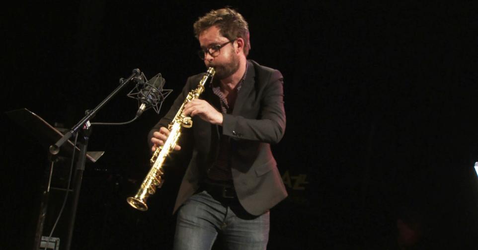 Le saxophoniste français Emile Parisien dialoguait avec le trompettiste américain Theo Croker en compagnie du pianiste Roberto Negro, du guitariste Manu Codjia, du batteur Nasheet Waits et du contrebassiste Joe Martin au cours du Festival Jazz sous les Pommiers, le 21 mai 2022.Casting