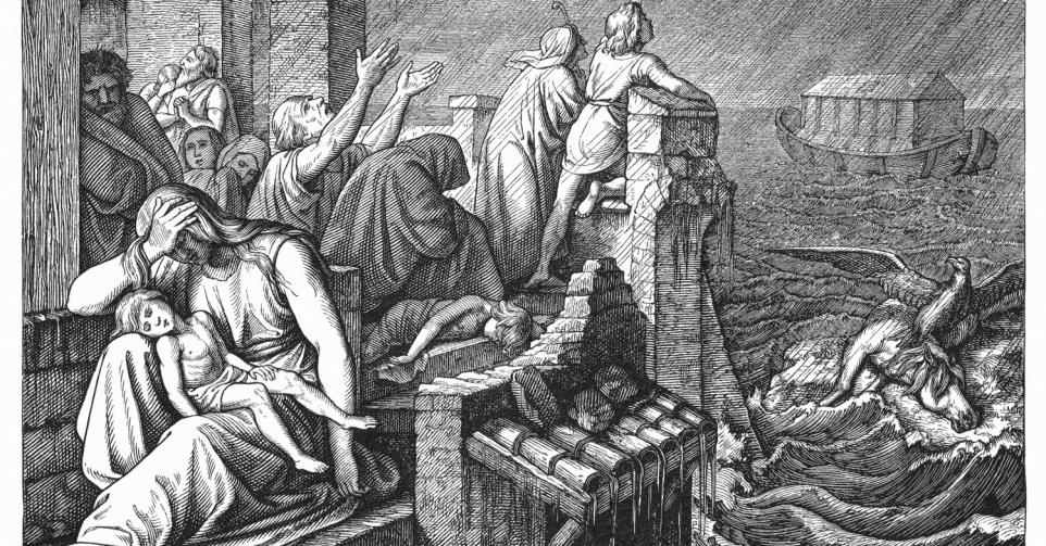 La version la plus répandue du déluge est sans doute celle de la Bible dans laquelle Noé, à bord d’une arche, doit embarquer sa famille mais aussi un couple de chaque espèce animale. Après une pluie de 40 jours et 40 nuits, le bateau se pose sur le mont Ararat. Noé, ne sachant pas si les eaux se sont pleinement retirées, envoie d’abord un corbeau. S’il ne revient pas, c’est qu’il s’est posé quelque part. Mais celui-ci réapparaît. Noé libère ensuite une colombe qui rentre portant dans son bec un rameau d’olivier. Au bout de sept jours, la colombe est à nouveau lâchée mais cette fois, ne revient plus. La terre est donc sèche. Les occupants de l’arche peuvent débarquer. Noé offre alors un sacrifice au Créateur qui promet en retour de ne plus éradiquer la vie terrestre. Un arc-en-ciel apparaît en signe de cette nouvelle alliance.