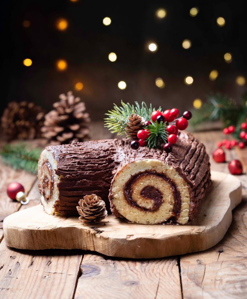 11.b. Les convives apprécieront de voir la bûche entière, mais il est ensuite recommandé de la couper en cuisine pour éviter un carnage sur la nappe.